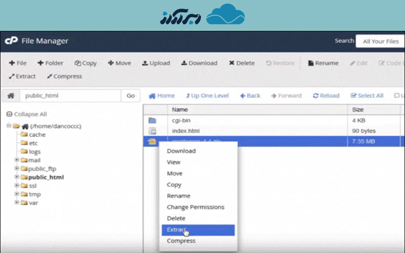 خرید سرور اختصاصی →مرحله دوم آموزش نصب وردپرس روی سی پنل هاست ؛ خارج کردن فایل وردپرس از حالت فشرده