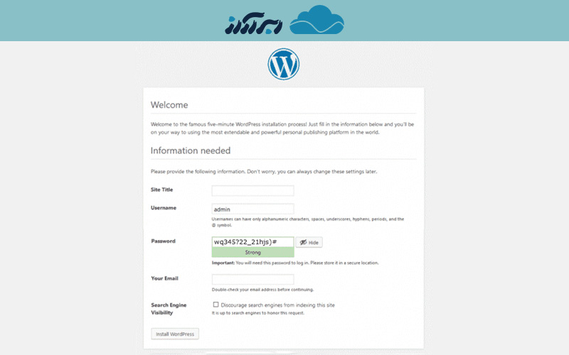 چگونه وردپرس نصب کنیم ؟ باید در ادامه این نصب، از یک رمز عبور ایمن استفاده کنید. به همین دلیل پیشنهاد ميکنیم از حروف کوچک و بزرگ، علائم و اعداد استفاده کنید. بعد از تعیین نام کاربری و رمز عبور، آنها را در یک مکان خاص از سیستم خود ذخیره کنید تا بتوانید از آنها در مواقع لزوم استفاده کنید.