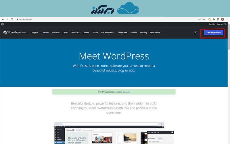 در نخستین مرحله از اموزش نصب وردپرس در سی پنل ابتدا باید جدیدترین نسخه وردپرس را از سایت رسمی wordpress دانلود کنید. برای اینکار پس از ورود به سایت وارد بخش Get WordPress شوید.