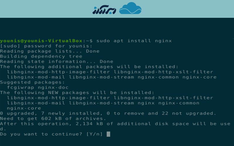 همانطور که گفتیم NGINX در مخزن نرمافزار رسمی اوبونتو موجود است. برای دانلود و نصب آن کافیست دستور زیر را در ترمینال تایپ کنید.
