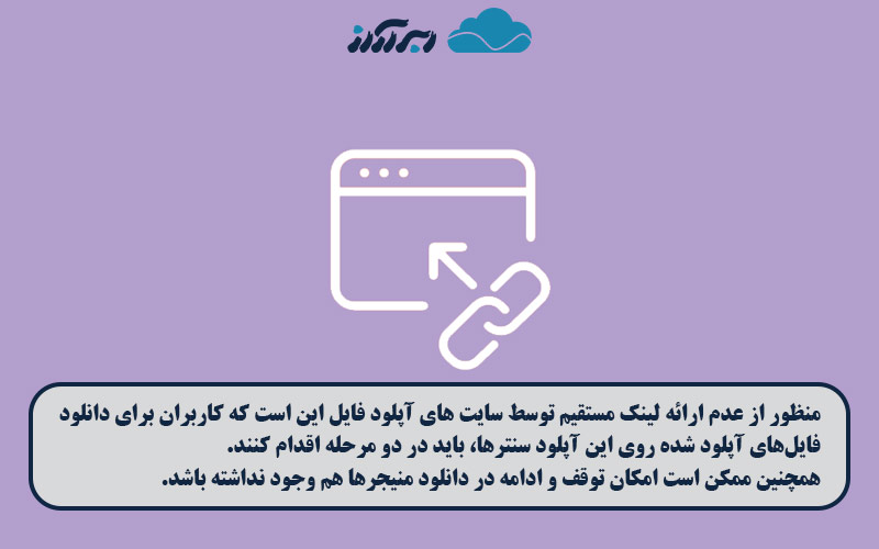 منظور از عدم ارائه لینک مستقیم این است که کاربران برای دانلود فایلهای آپلود شده روی این آپلود سنترها، باید در دو مرحله اقدام کنند. همچنین ممکن است امکان توقف و ادامه در دانلود منیجرها هم وجود نداشته باشد.